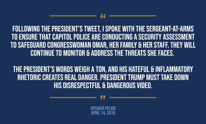 Speaker Nancy Pelosi is piswoest op Oom Donald wegens bovenstaande "dangerous" video, en sommeert de CEO of the Free World het filmpje te verwijderen. Wegens "hateful" (lol) en ontvlambare retoriek (lol). Trump reageerde met deze ijzersterke video op de ronduit stupide uitspraak van afgevaardigde (D) Ilhan Omar over de aanslagen van 9/11 ("Some people did something."). Wat taalkundig misschien wel correct is, maar emotioneel tactisch historisch nogal debiel. En nu wordt Ilhan Omar dus "bedreigd" want dat is tegenwoordig de nieuwe naam van kritiek krijgen. Om te voorkomen dat Ilhan Omar door woedende Muricanen met pek en veren terug naar Somalië wordt gebonjourd moet Trump dus zijn tweet + filmpje verwijderen. Meanwhile is er in New York en omstreken is er een boycott gaande van The New York Post dat met een ijzersterke voorpagina reageerde op de uitspraak van Omar. Developing...