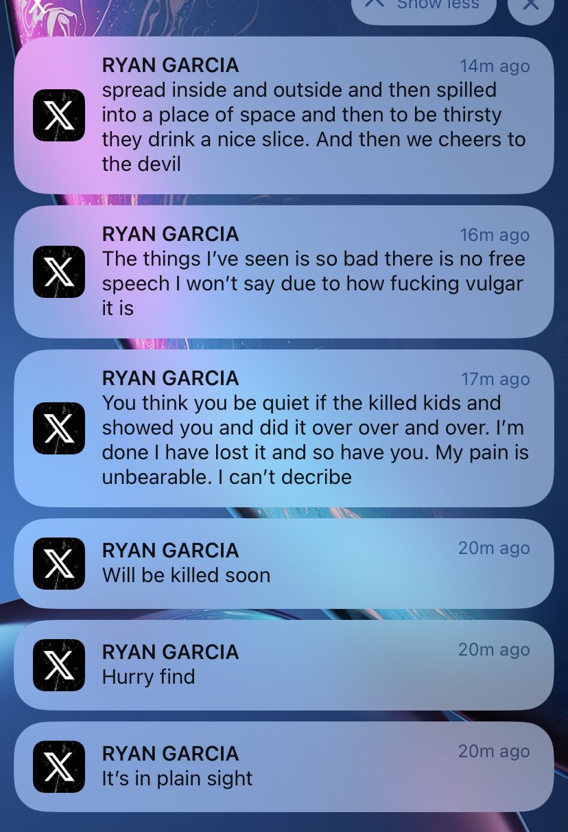 Welnu, in het hoofd van deze Garcia is het momenteel een groot Boggle-blok. Het begon allemaal met warrige berichten op X en een persconferentie voor een gevecht met Haney waar hij een extreem wazige indruk maakte en door zijn opponent werd beschuldigd van cokegebruik. Sindsdien is het he-le-maal bal qua Willem de Wappie. Hij spuwde tientallen verontrustende berichten de wereld in, over moord en dood en complot, met verwijzingen naar 666, Bohemian Grove (zogenaamd een 'duister genootschap voor elite', waar Alex Jones zich mee bezig hield), ufo's, aliens, satan, illuminati en onheilspellende meuk als 'hurry find - will be killed soon'. Tweets die hij in veel gevallen later weer verwijderde, trouwens. Vervolgens kwam er een 'uitlegvideo' waar geen touw aan vast te knopen viel (video hieronder) met gebrabbel dat hij geen controle meer heeft over zijn telefoon, dat zijn Instagram is gehackt en dat er misbruik van hem wordt gemaakt: "I'm just being really taken advantage of. They've tried to put me in jail, they're blocking my cards, I can't access my money. Nobody is hitting me back, I don't know what's going on but just know I'm okay."